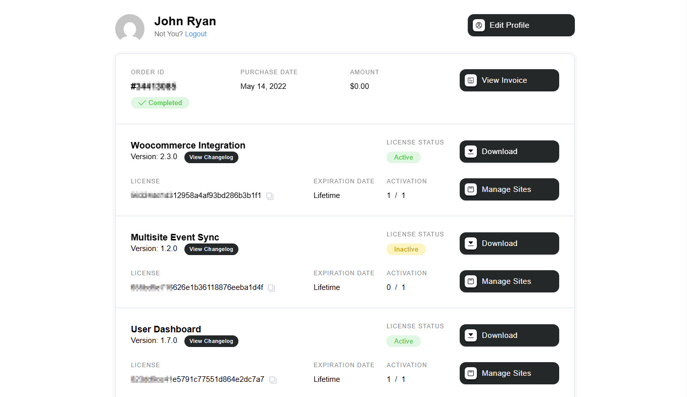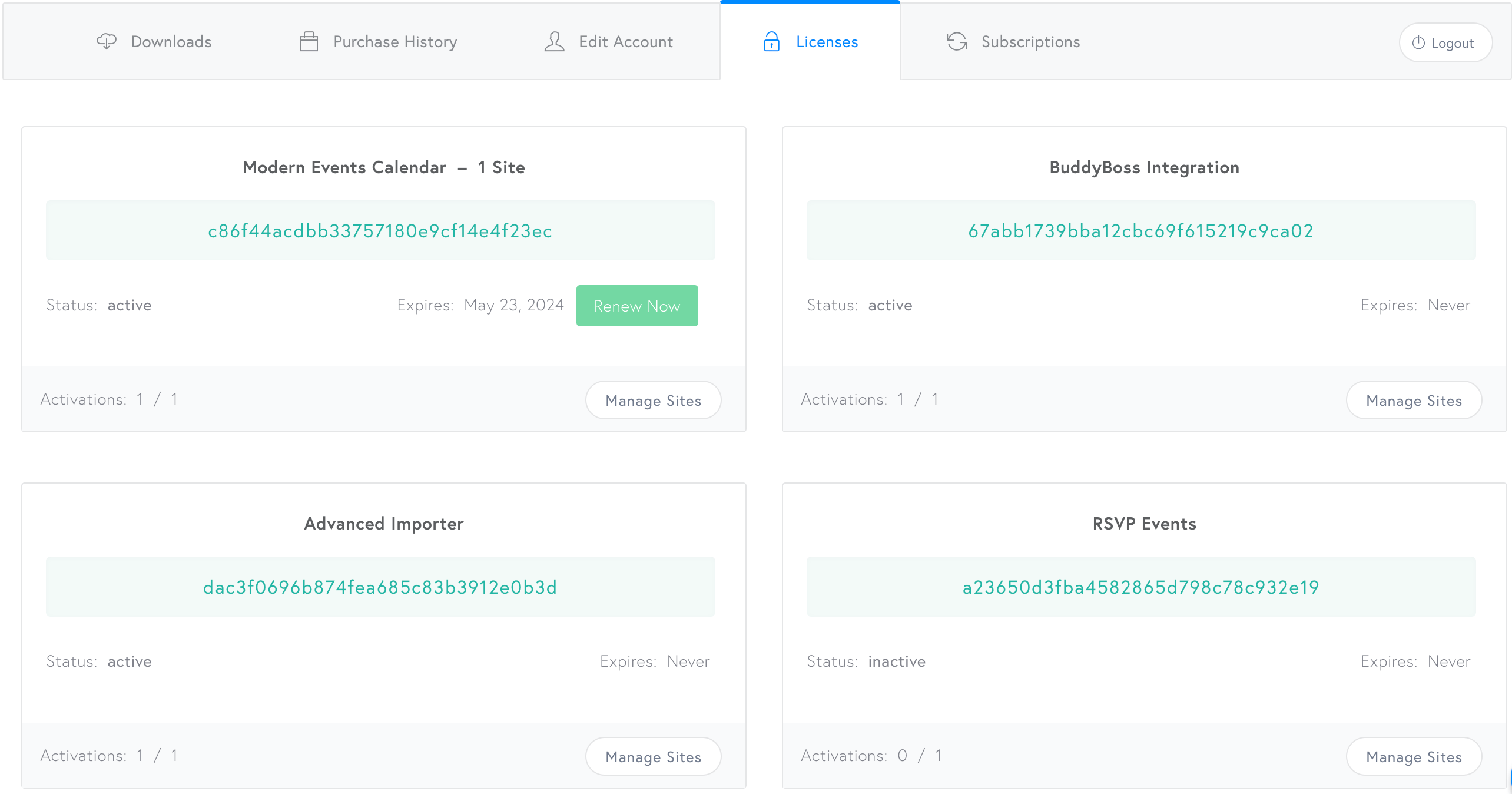 If, by any chance, you can’t activate MEC, visit this link. To access the license keys for the activation of Modern Events Calendar, navigate to the Webnus download panel, and click on the Licenses menu. Then on the new page, you can see the license key.
