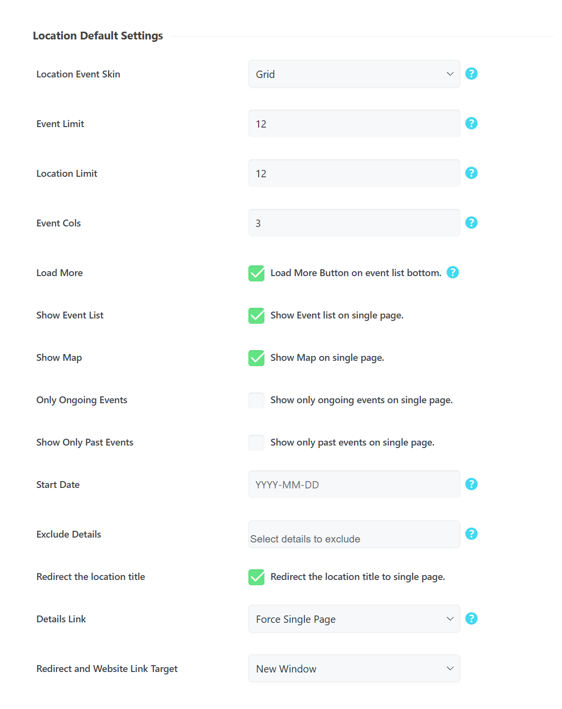- Show Event List: Enable or disable the event list on the location’s single profile page.