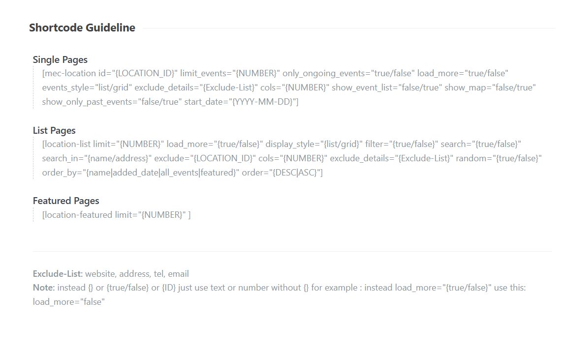 There are three main types of shortcodes available: Single, for displaying specific locations; List, for displaying all available locations; and Featured, for displaying locations that have been marked as featured.