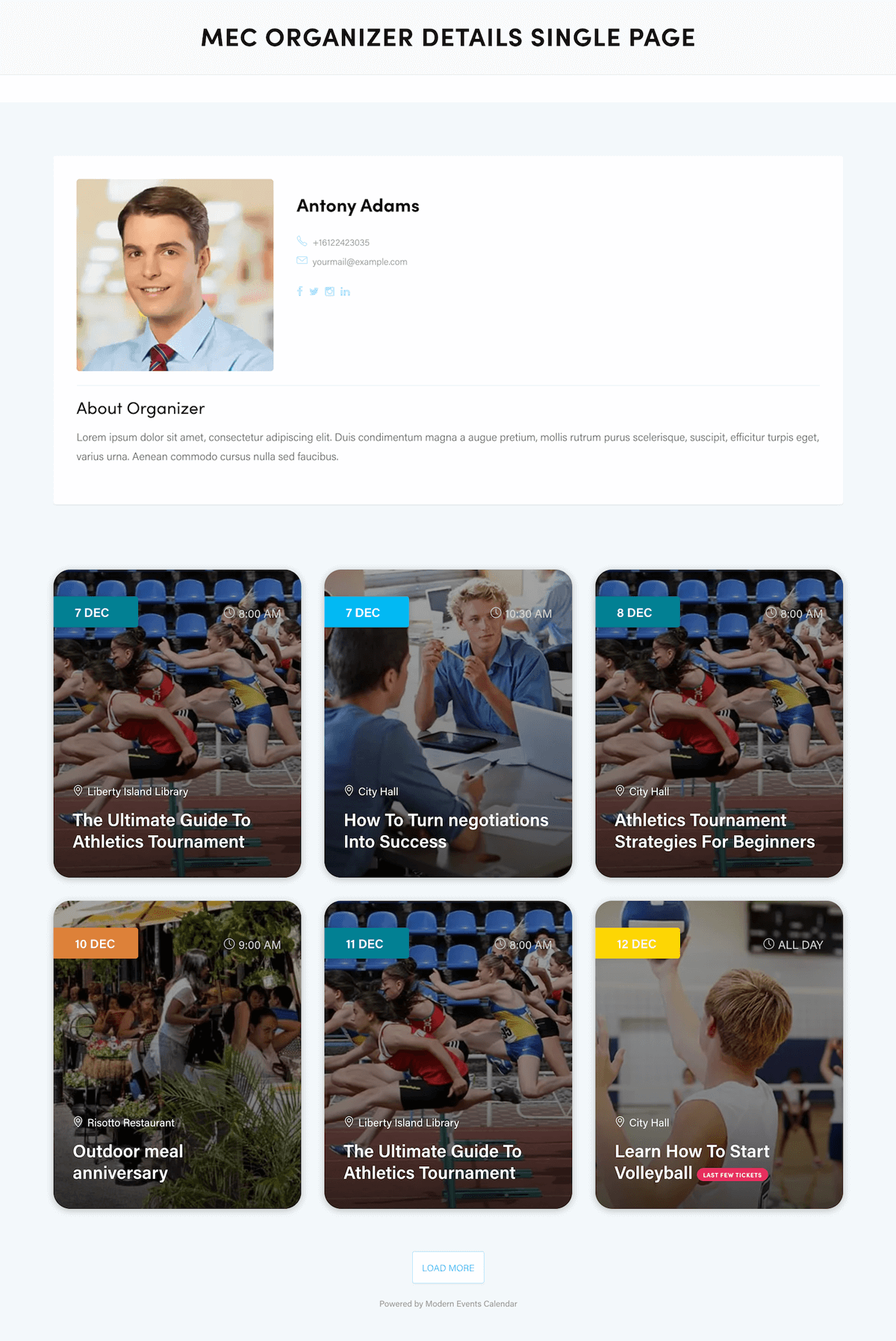 - load_more=”{true/false}” → Enable or disable the “Load More” button for the organizer list.