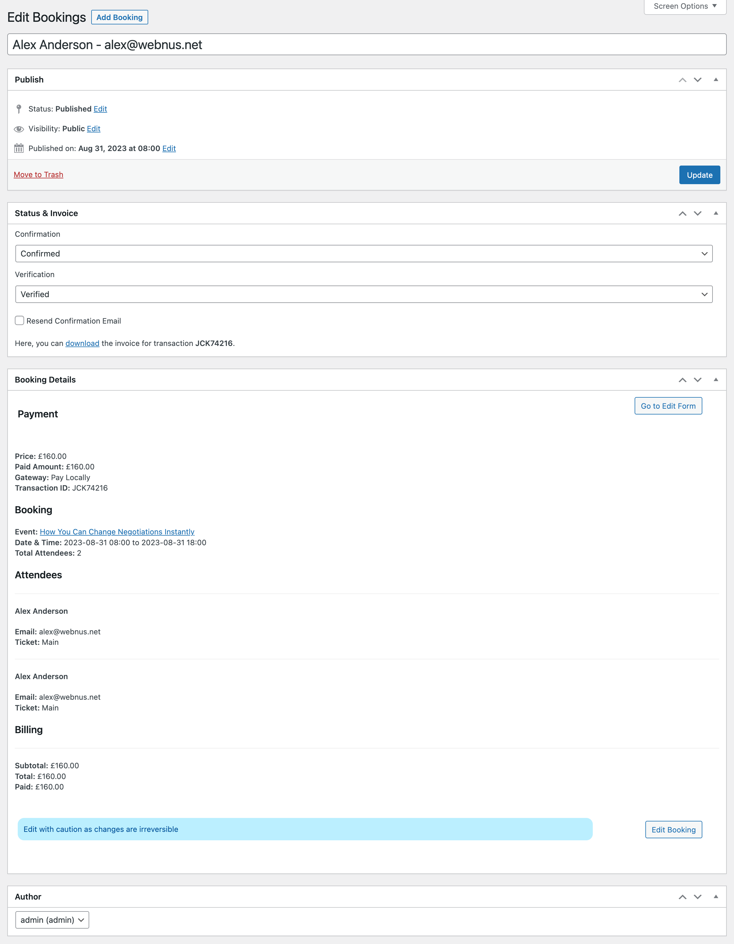 From your WordPress dashboard, you can view and edit the bookings in one place just by going to the WP Dashboard > Bookings > Bookings section.