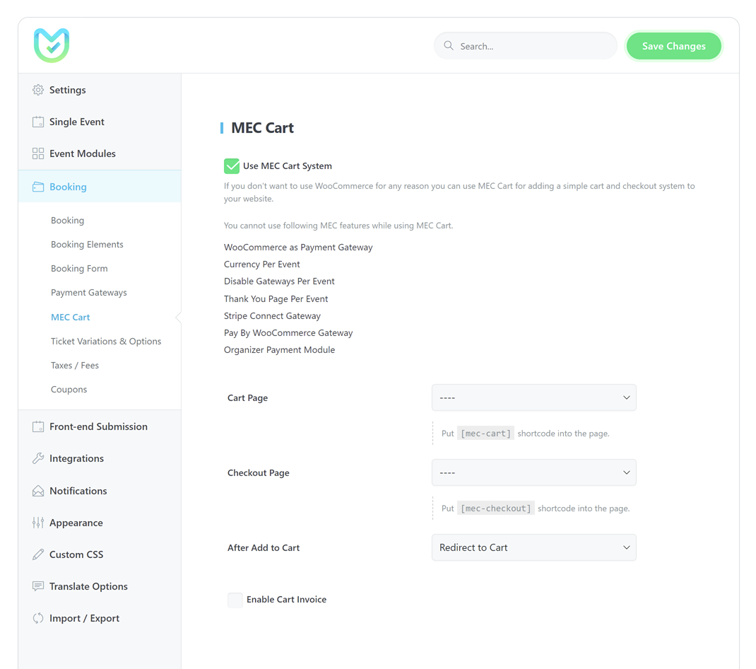 MEC Cart in Modern Events Calendar allows you to create an in-app cart and checkout system for your users. In order to enable this feature, you need to go to MEC Settings > Booking > MEC Cart and check the “Use MEC Cart System” option.