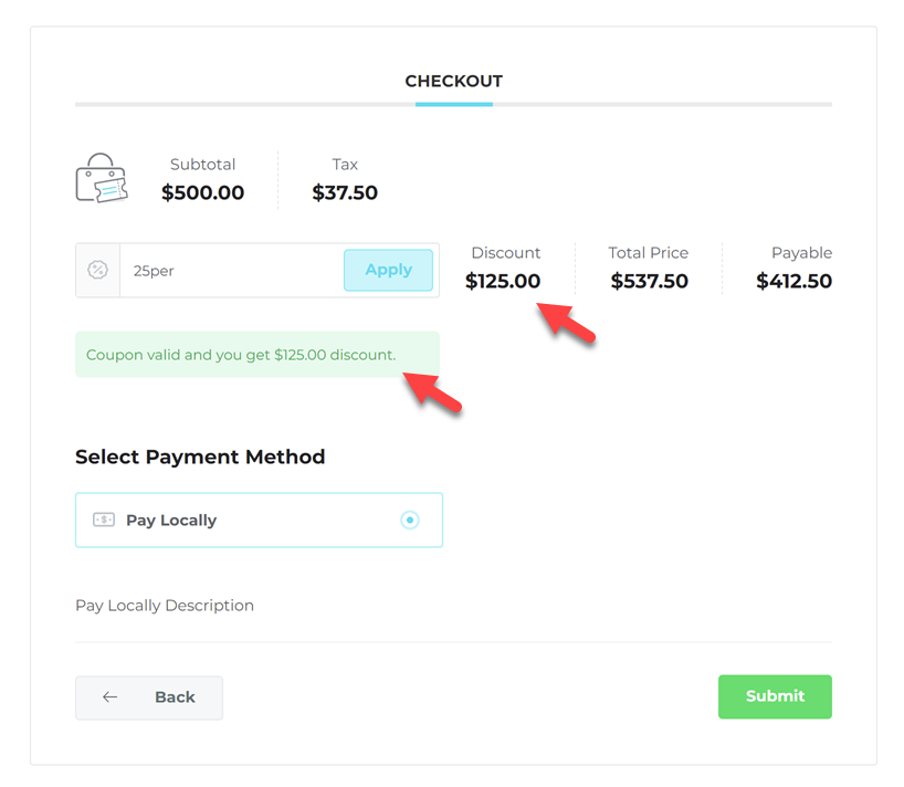 Name: Coupon name or code should be written without any whitespaces. Your users will be able to enter this code as their discount code in their booking process.
