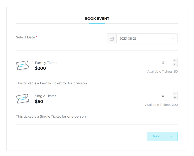 Now users can choose between single and family tickets and complete the booking process. As you can see in the screenshot below, the number of family tickets that can be booked is equal to 50. It means 200 divided by 4.