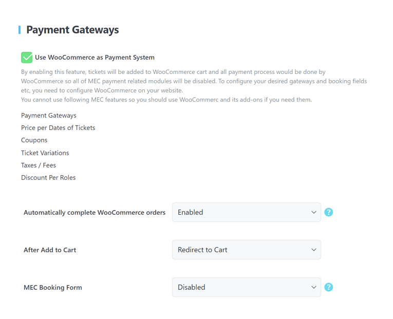 MEC Booking Form: By enabling the “MEC Booking Form,” users should fill out the booking form in MEC, and then they will be redirected to checkout.