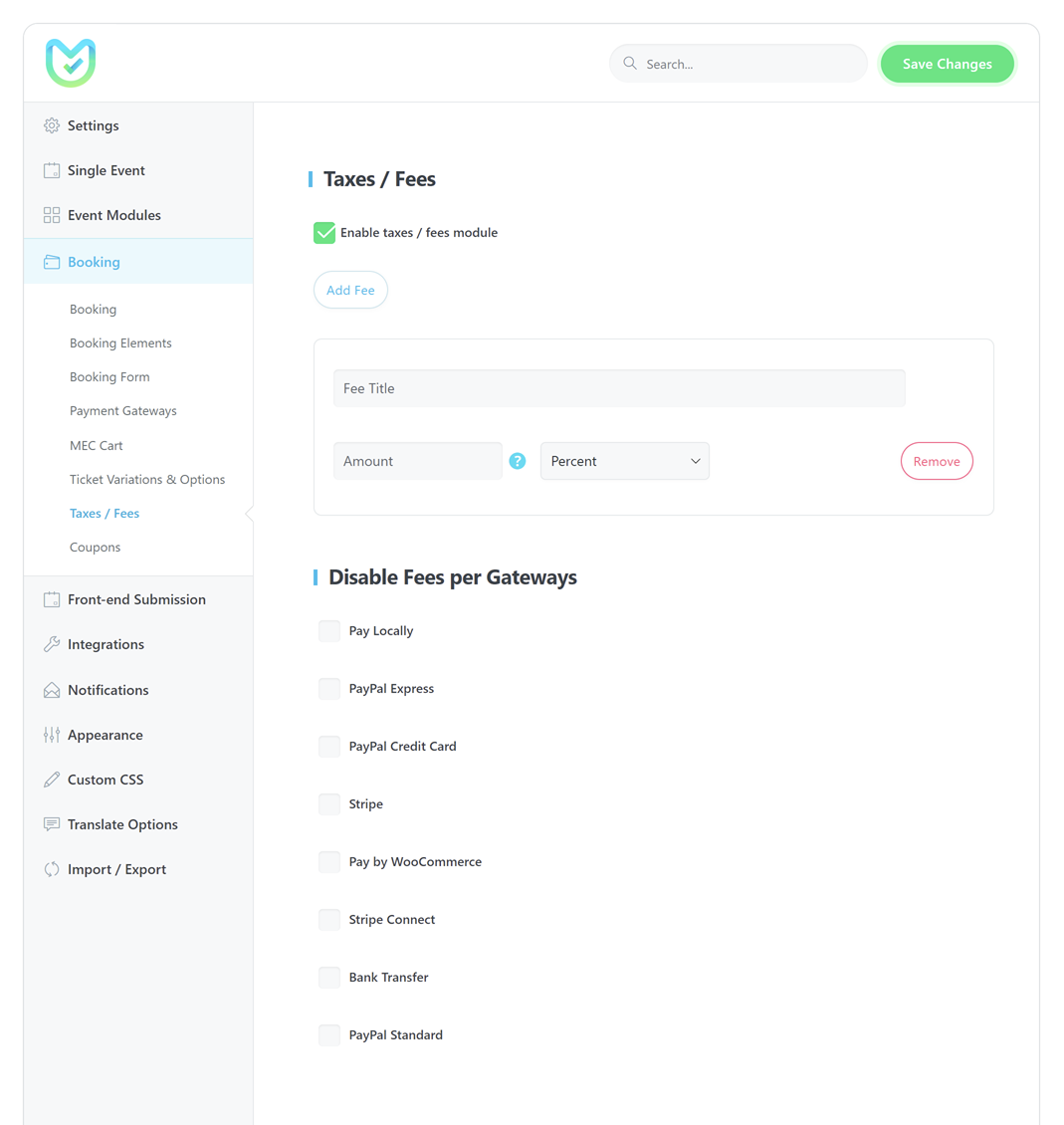 Within the Modern Events Calendar plugin’s settings section, activating the taxes/fees option is a simple process. You can create a fee with your own specific criteria in that section. It should be noted that taxes and fees are actually the same in MEC settings, but you can differentiate them by giving each one a different name.