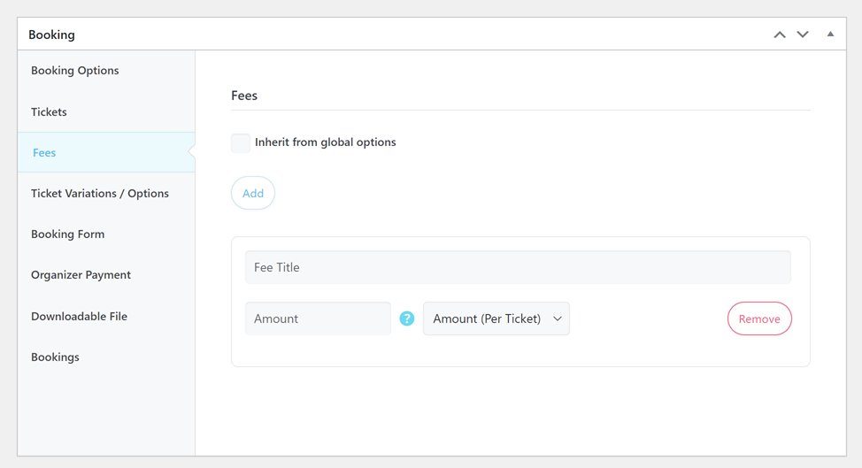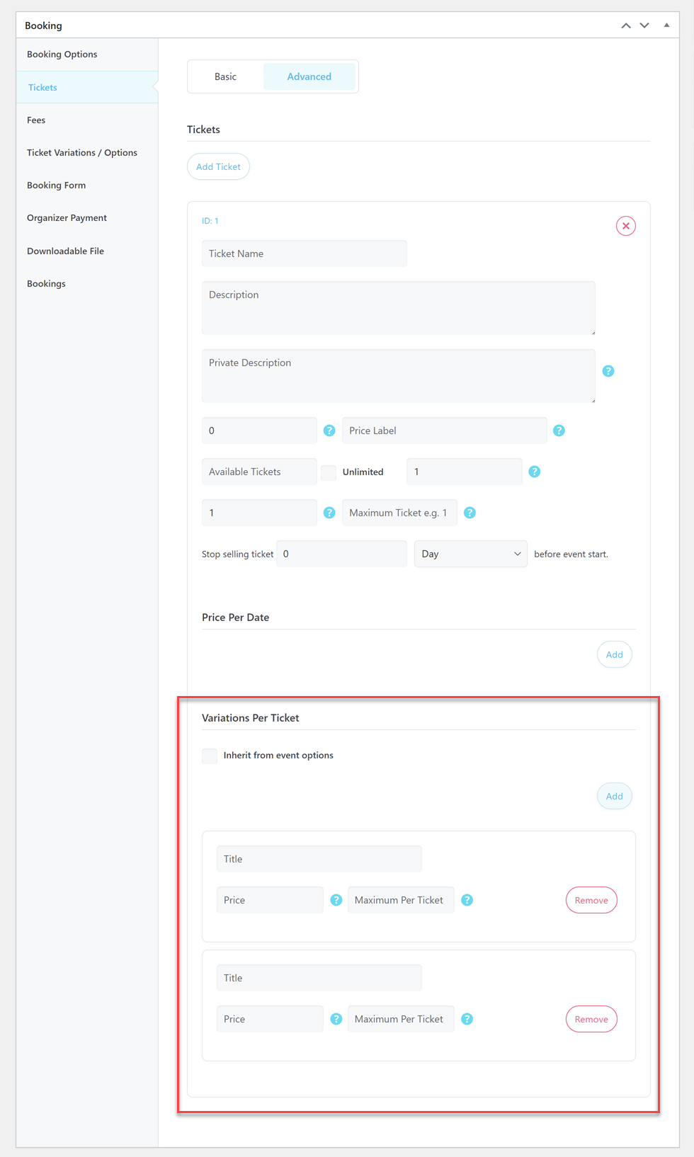 After setting up a default preset for your ticket variations, you can either use them or customize them for each event. In order to do that, you need to go to Single Event Edit Page > Booking > Ticket Variations / Options and uncheck the “Inherit from global options” option.