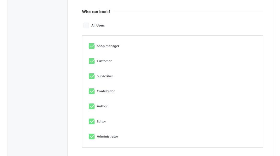 By default, all users can book your events. You can restrict event booking to specific roles by unselecting the “All Users” checkbox.