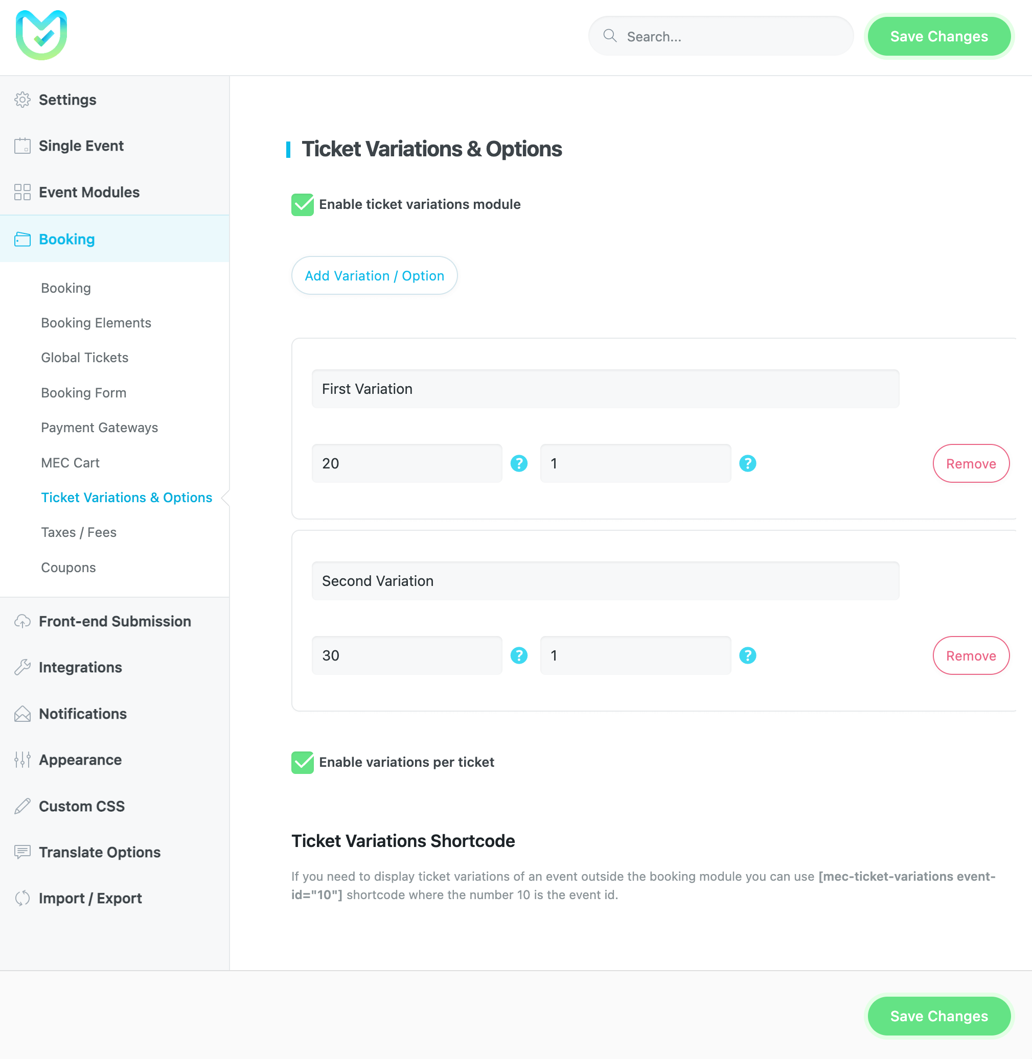 The ticket variations option in the Modern Events Calendar lets the users choose more items and include them in their reservations while booking an event. For example, reservations for a meal, pre-ordering a book or an article, or whatever you need on the sidelines of your event. In order to enable this option, you need to go to MEC Settings > Booking > Ticket Variations & Options and check the “Enable ticket variations module” option.