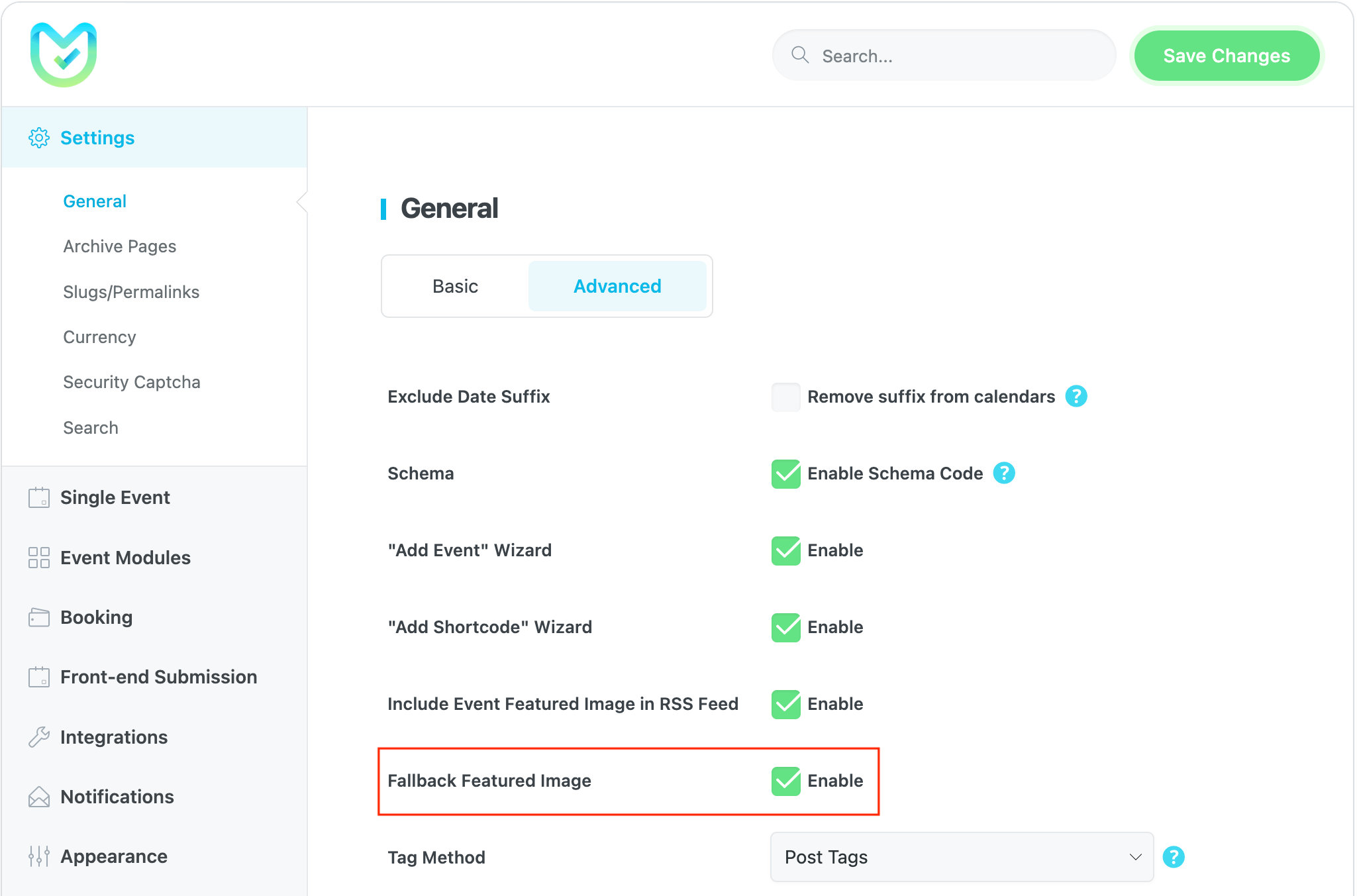 First, you need to enable the Fallback Featured Image option in MEC Settings > General > **Advanced **Tab.