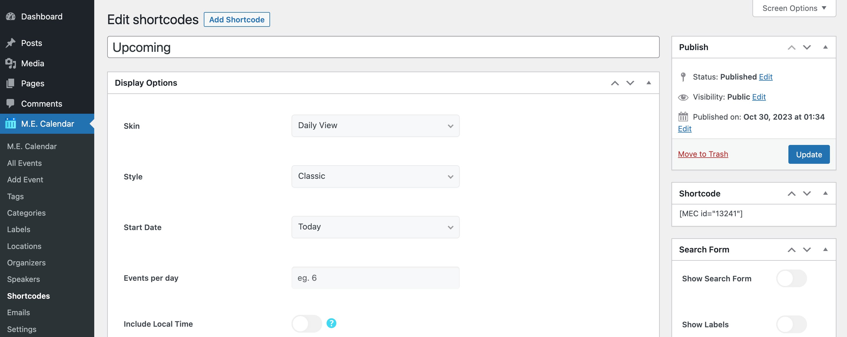 You can use shortcodes in your internal pages to have this on your website. The shortcodes are located in **M.E. Calendar > Shortcodes.**