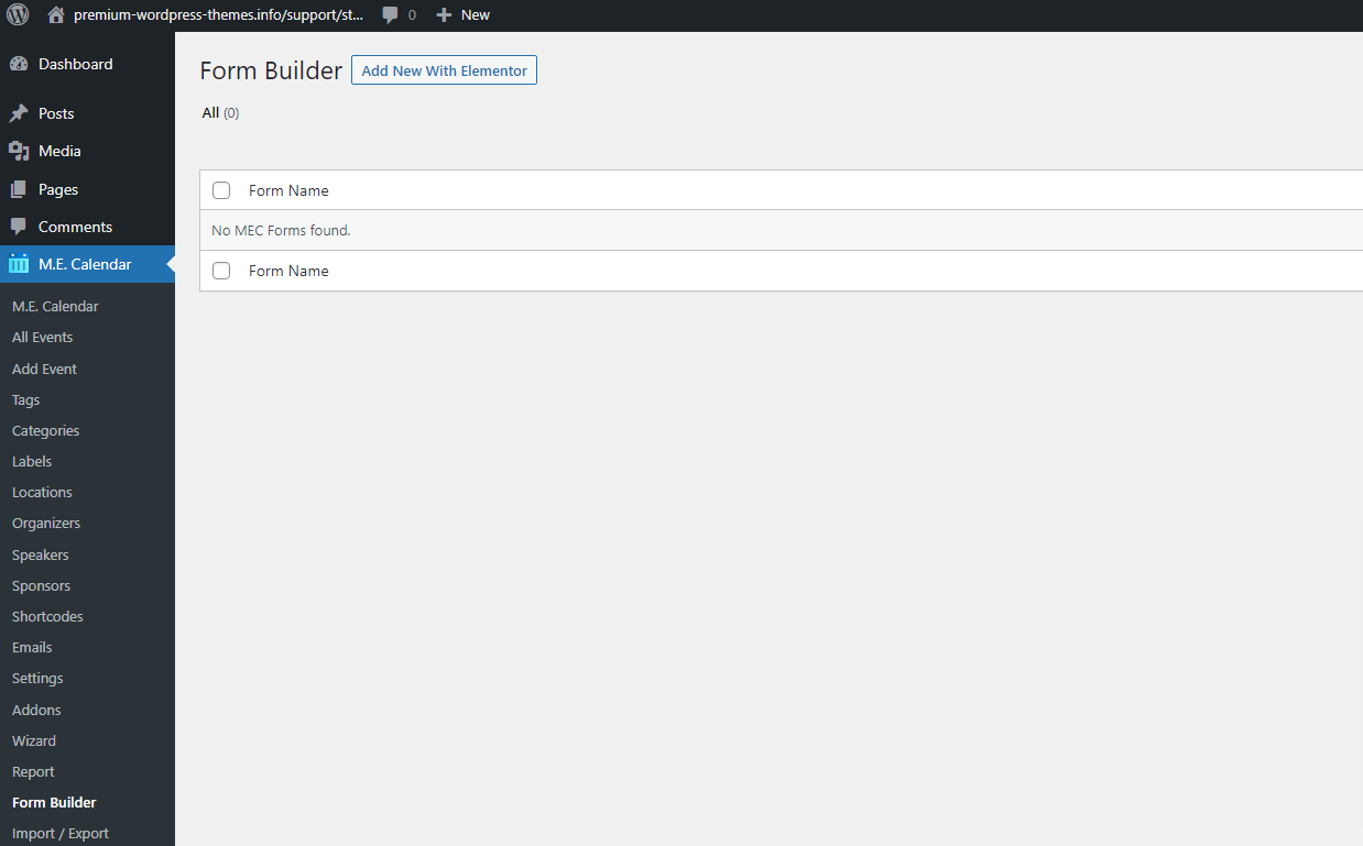 To create your first form, go to MEC > Form Builder, click on the Add New With Elementor button, create a new template, and open it with Elementor.