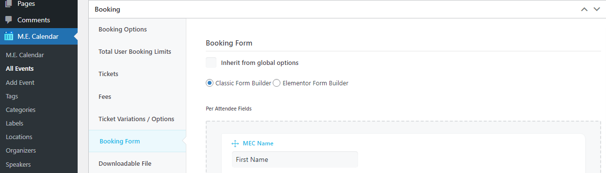 - For a classic form, go to MEC Settings > Booking > Booking Form, and you have the option to set a global form for all your events, or you can customize your very own form from the event’s editing page. Or skip all that and create your very own forms using the Elementor addon.