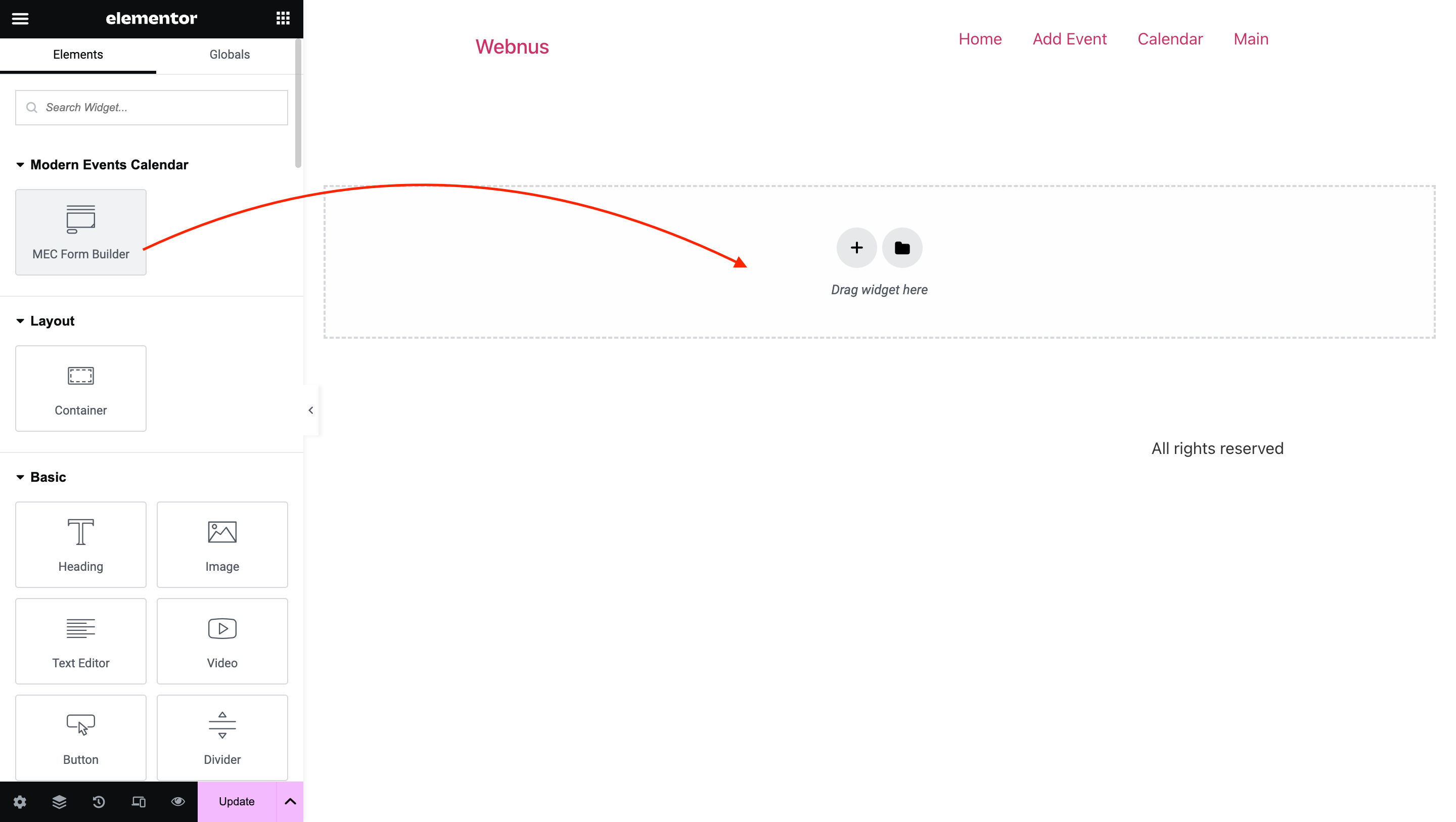 Now, you will then be redirected to Elementor Page Builder. Then, find “MEC Form Builder” and place it in one of the sections.