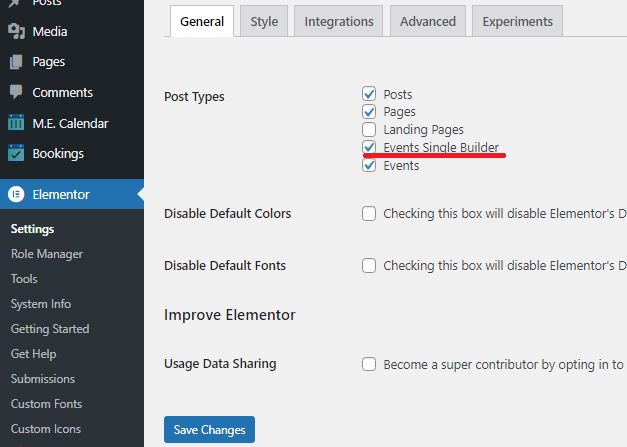 • Enabling the Post Type: To make event templates editable in Elementor, navigate to Elementor > Settings > General and check the box for the Events Single Builder post type.