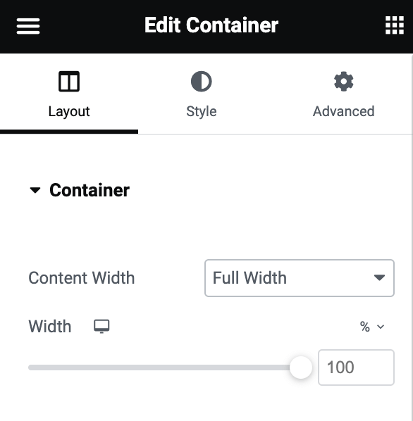 2\. In the Elementor Editor for your template, set the section Layout > Content Width to Full Width.