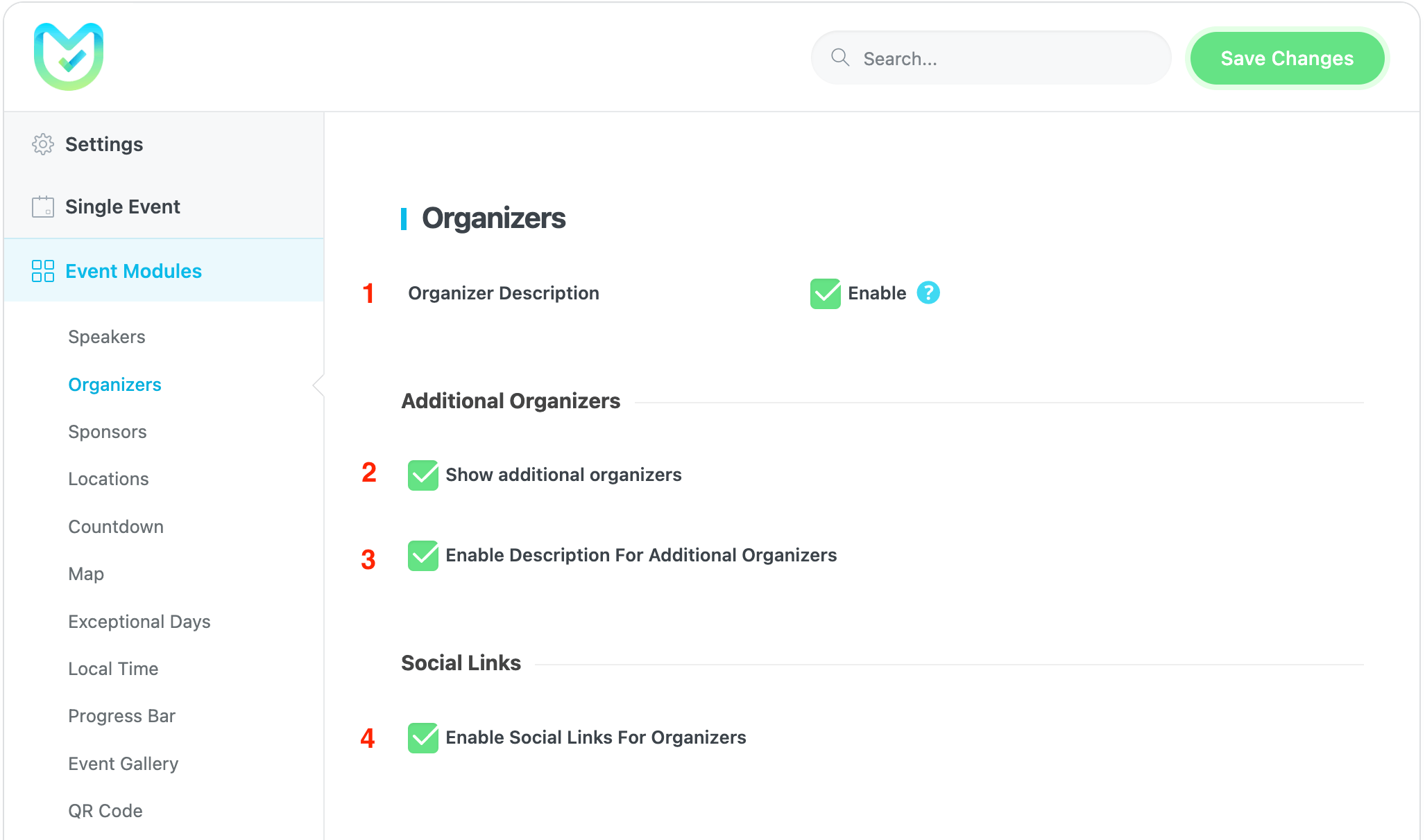 3. Description for organizer: To enable this option in the event, you need to enable MEC Settings > Event Modules on the single event settings. You can also navigate to the additional organizer tab to enable this item for additional organizers.