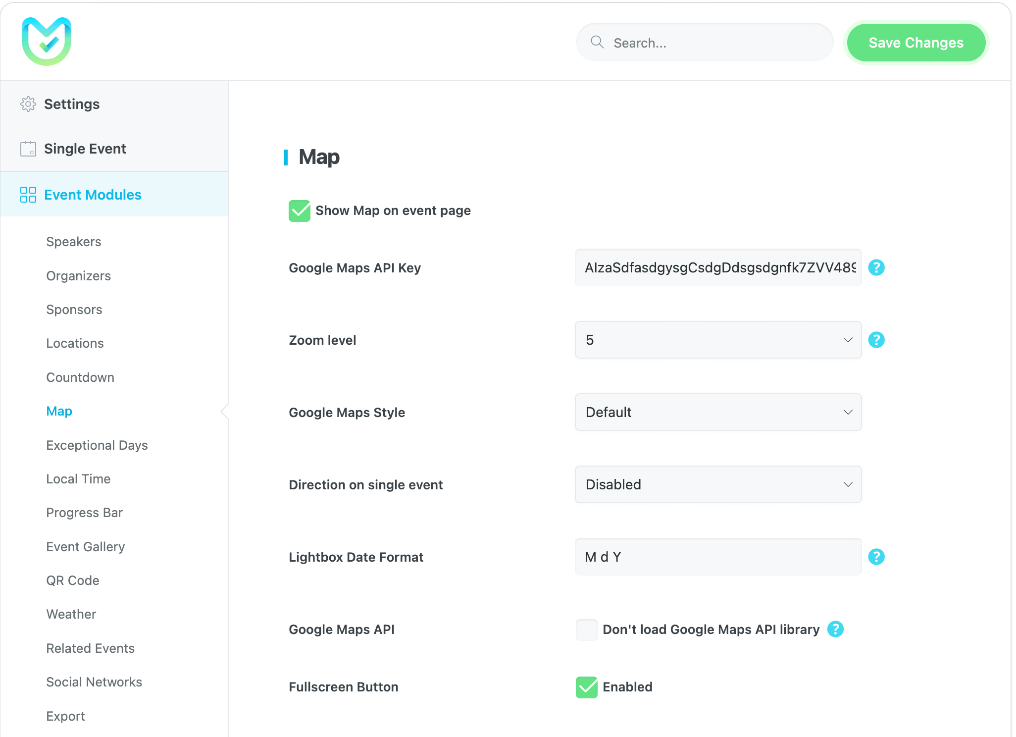 To activate and configure this module, you need to go to MEC Settings > Event Modules > Map and check the Show Map on event page option.