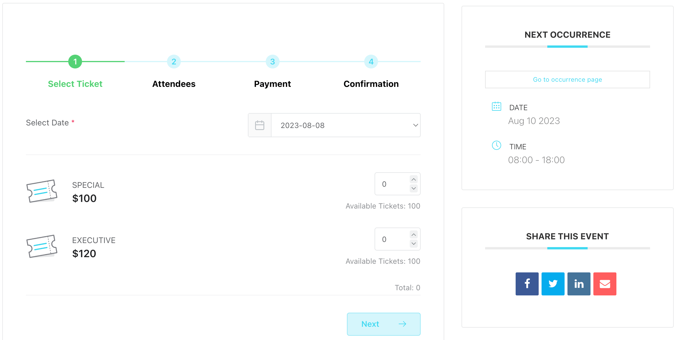 When the Event Repeat option is enabled for an event, you want your users to see when exactly is the next time for this particular event. You can simply provide your users with this by enabling Next Event Module.