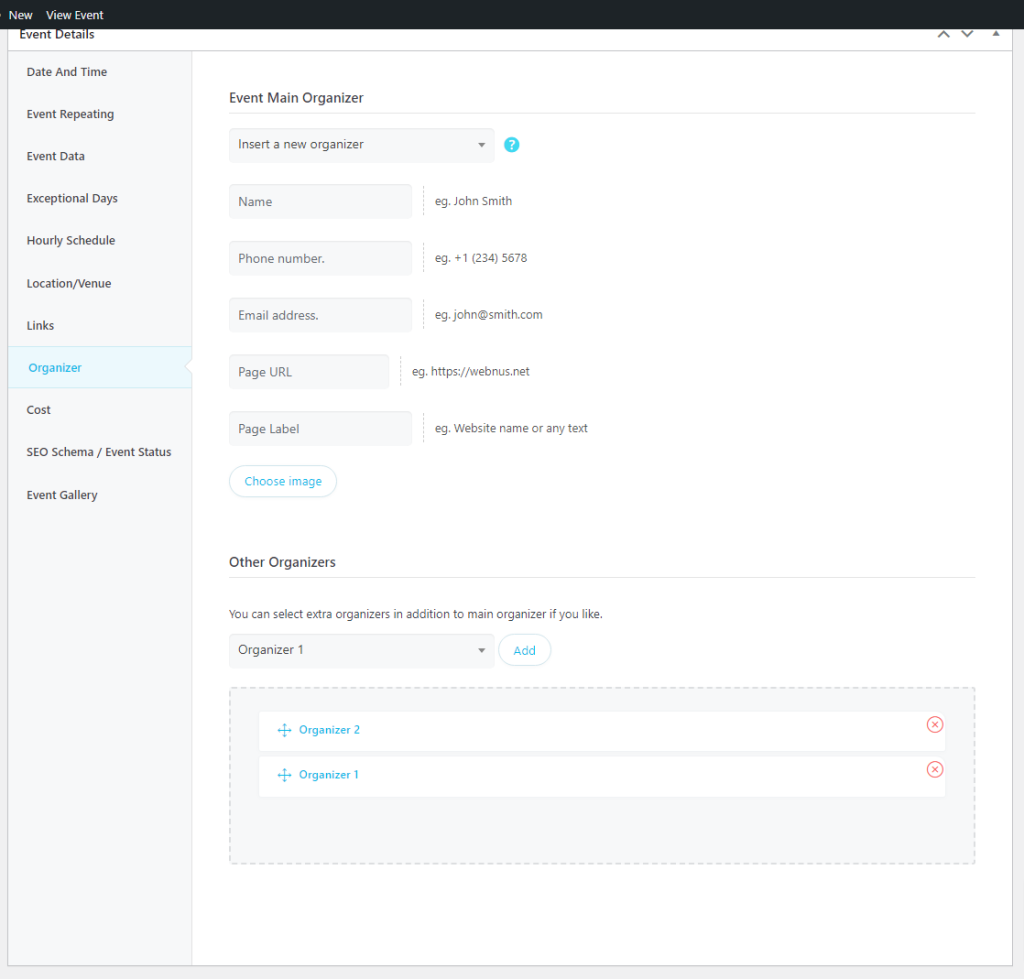 If your event has a specific organizer, then you can easily set it up through this option. You can also add multiple organizers.