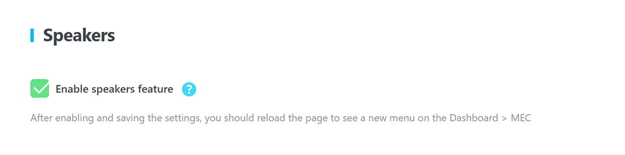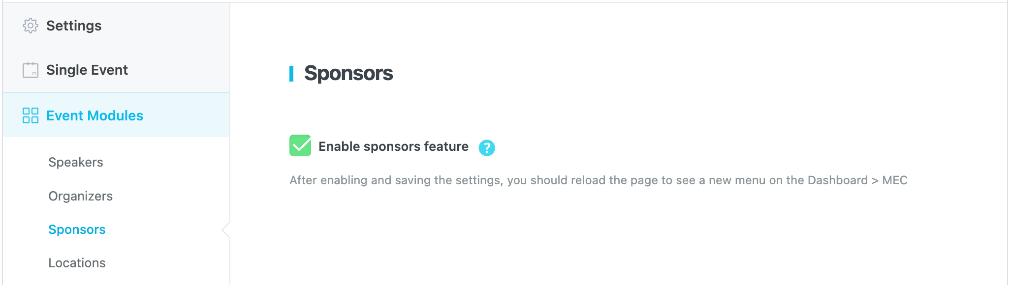 After enabling and saving the settings, you should reload the page to see a new menu in the WP Dashboard > MEC.