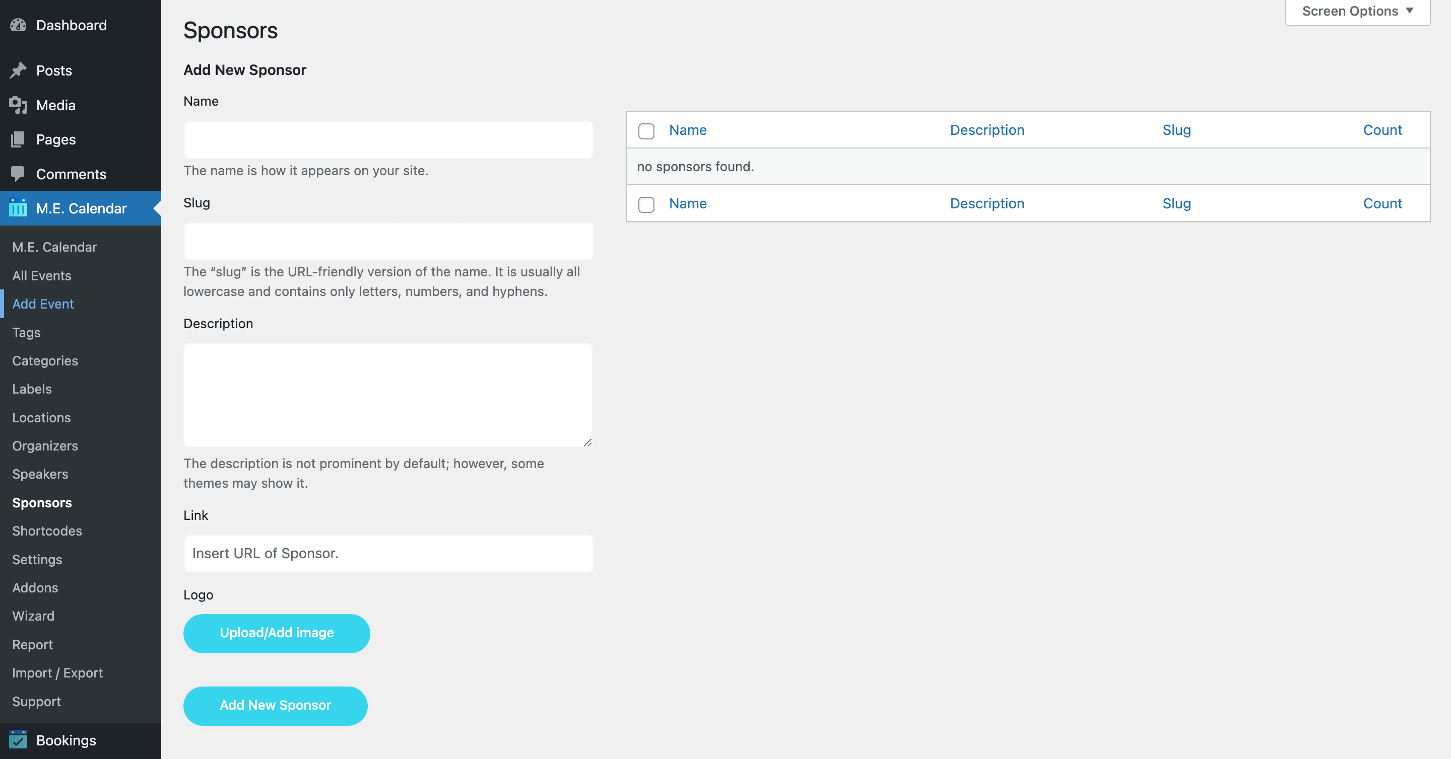 You can add the sponsors here with their names, descriptions, links, and logos. However, it is possible to add the sponsors directly from the single event edit page as well.