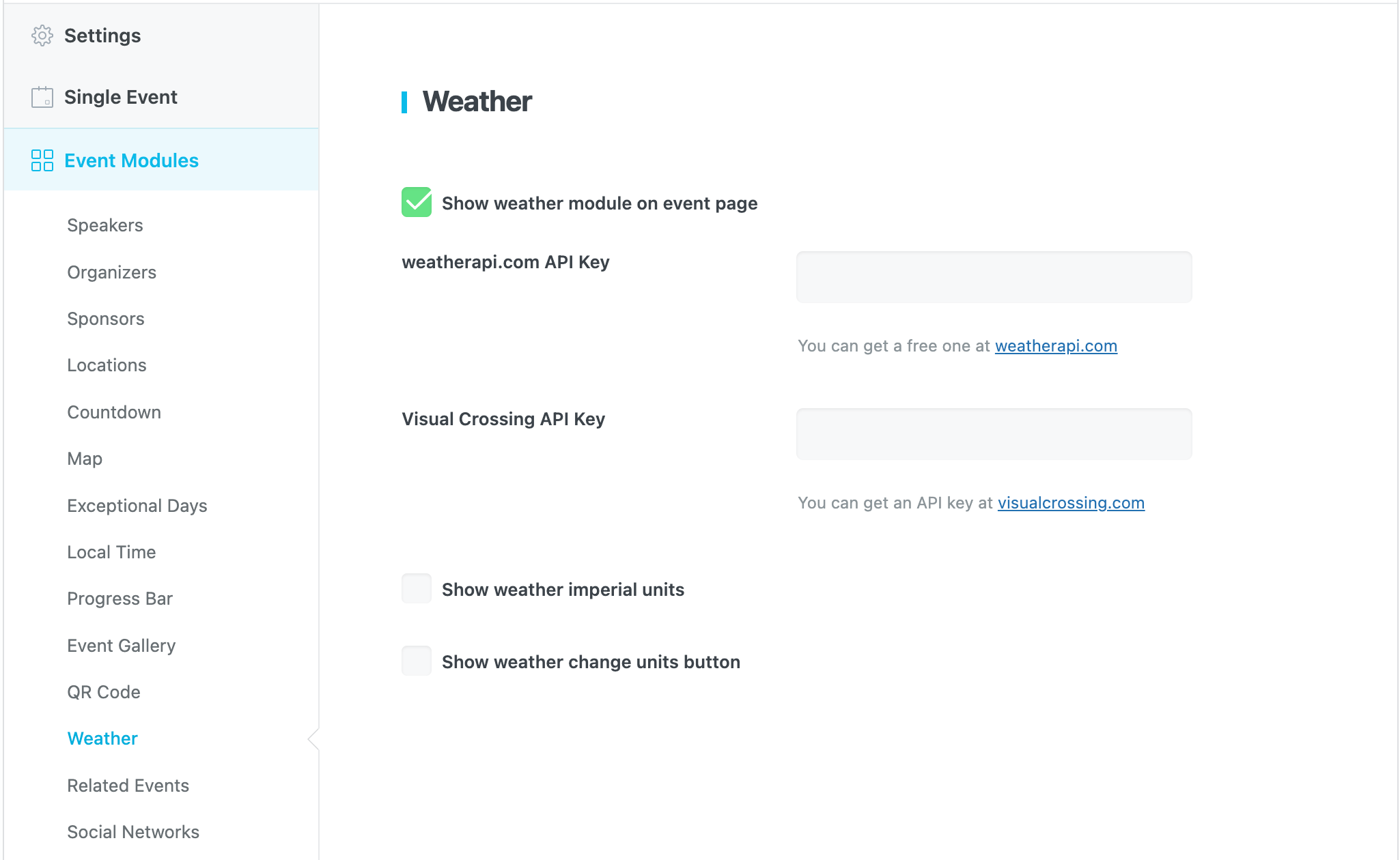 To enable this module, you need to go to MEC Settings > Event Modules > Weather and check the Show weather module on event page option.