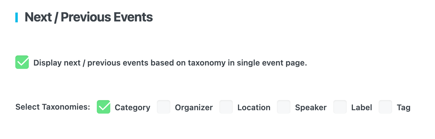 You can filter your next and previous events to be shown based on the following taxonomies: Category, Organizer, Location, Label, and Tag.