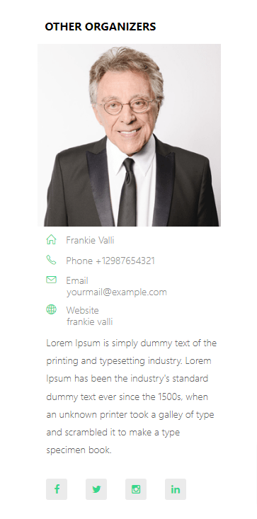 You can change the ordering of the additional organizer’s list with drag and drop. The organizer’s section on the single event page should look like this: