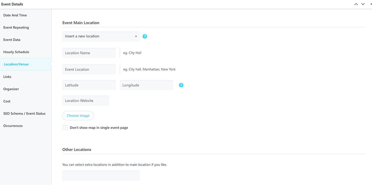 This section also includes an important field (Address) for those who want to set up Google Maps API in their event. Of course, if you want to set up an event quickly, you have several options for configuring the location section of each event.