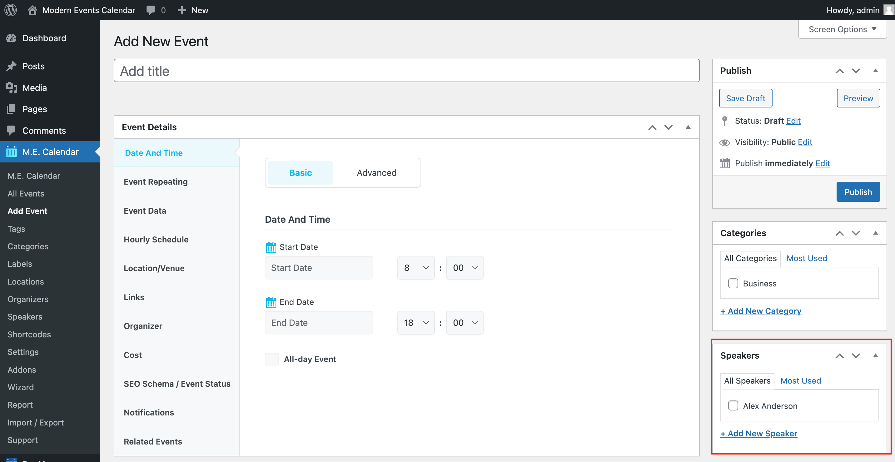 To create a new speaker, navigate to M.E. Calendar and select Speakers. To ensure that the speakers’ section appears in the single events sidebar, go to MEC Settings > Single Event > Sidebar and enable the speaker’s option.