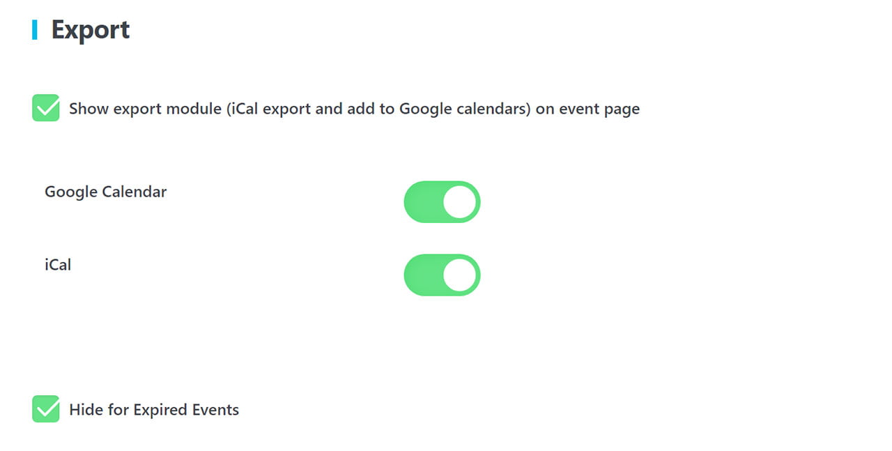 The export module in Modern Events Calendar has been designed to give your attendees the possibility to add the date and information of an event to their own preferred calendar (such as Google Calendar) and keep themselves up-to-date about the events and all the ongoing programs that you might offer.