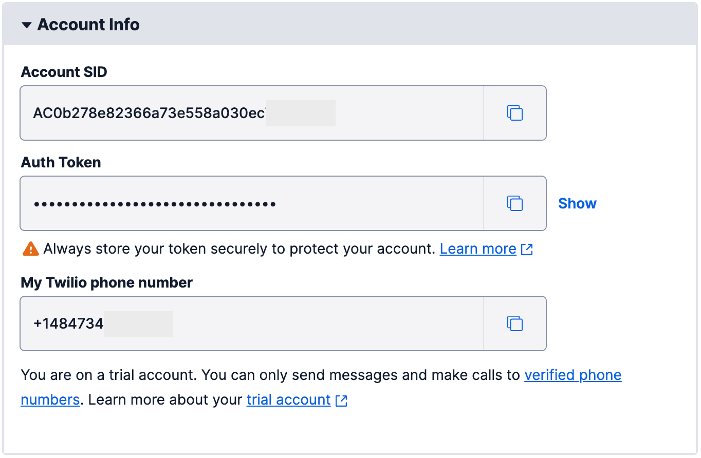 - Account SID: Enter the account SID from your Twilio Console account info box here.