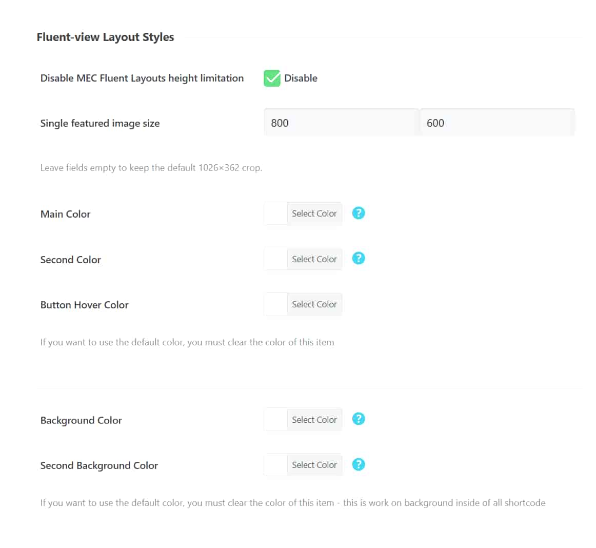 For site-wide design consistency, the addon provides a management section for colors and layout behavior located in MEC Settings > Appearance under the Fluent-view Layout Styles section.