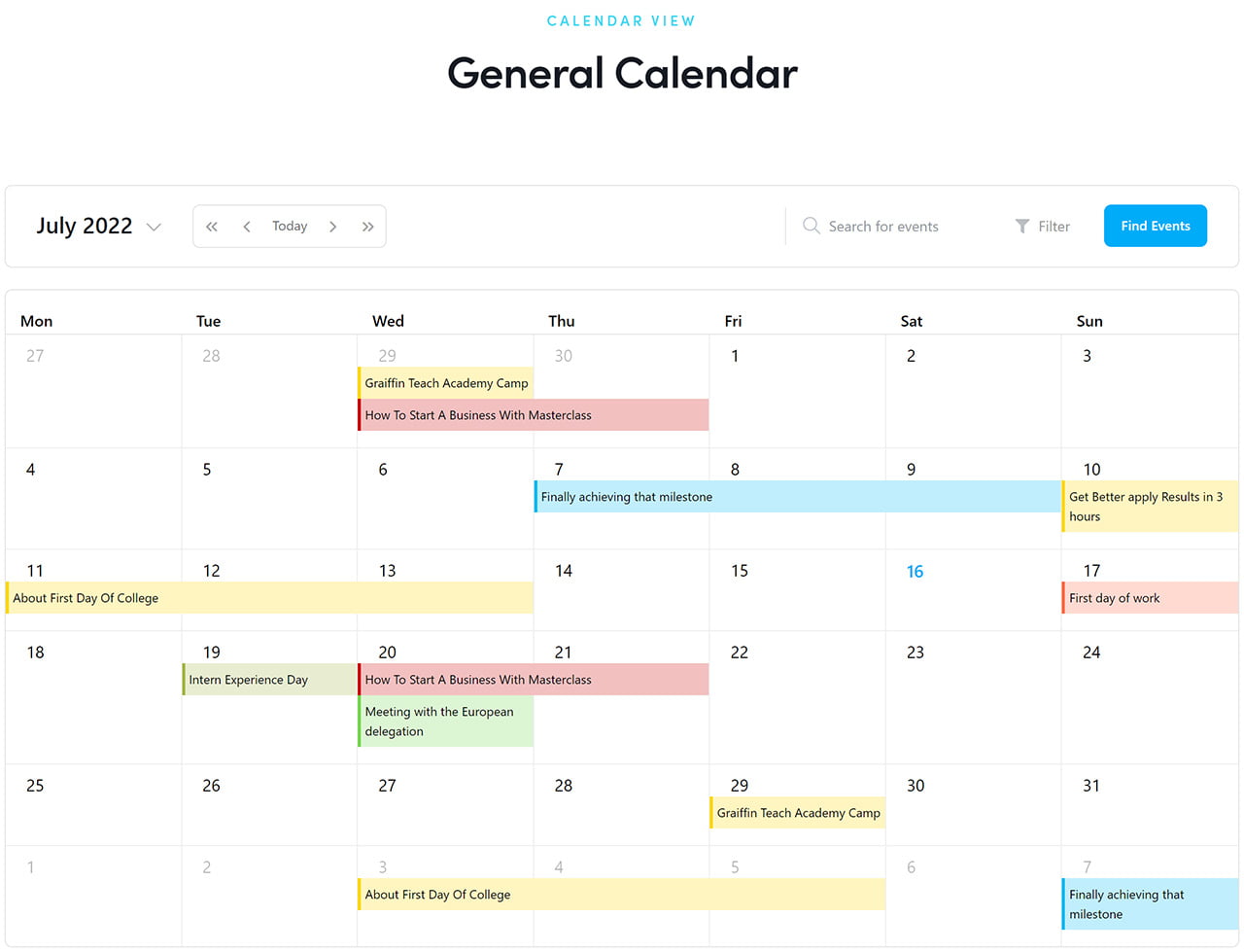 General Calendar View Skin in MEC has one unique layout that can be set through the Modern Events Calendar setting and adjustment of shortcodes.