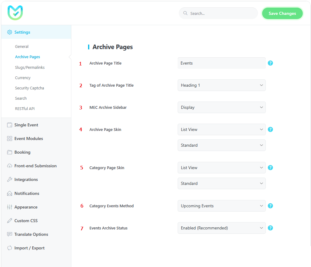 In General Settings, you will have access to modify the main global settings of the Modern Events Calendar, such as SEO, categorizing, and indexing for search engines. Not to mention sorting out your events.