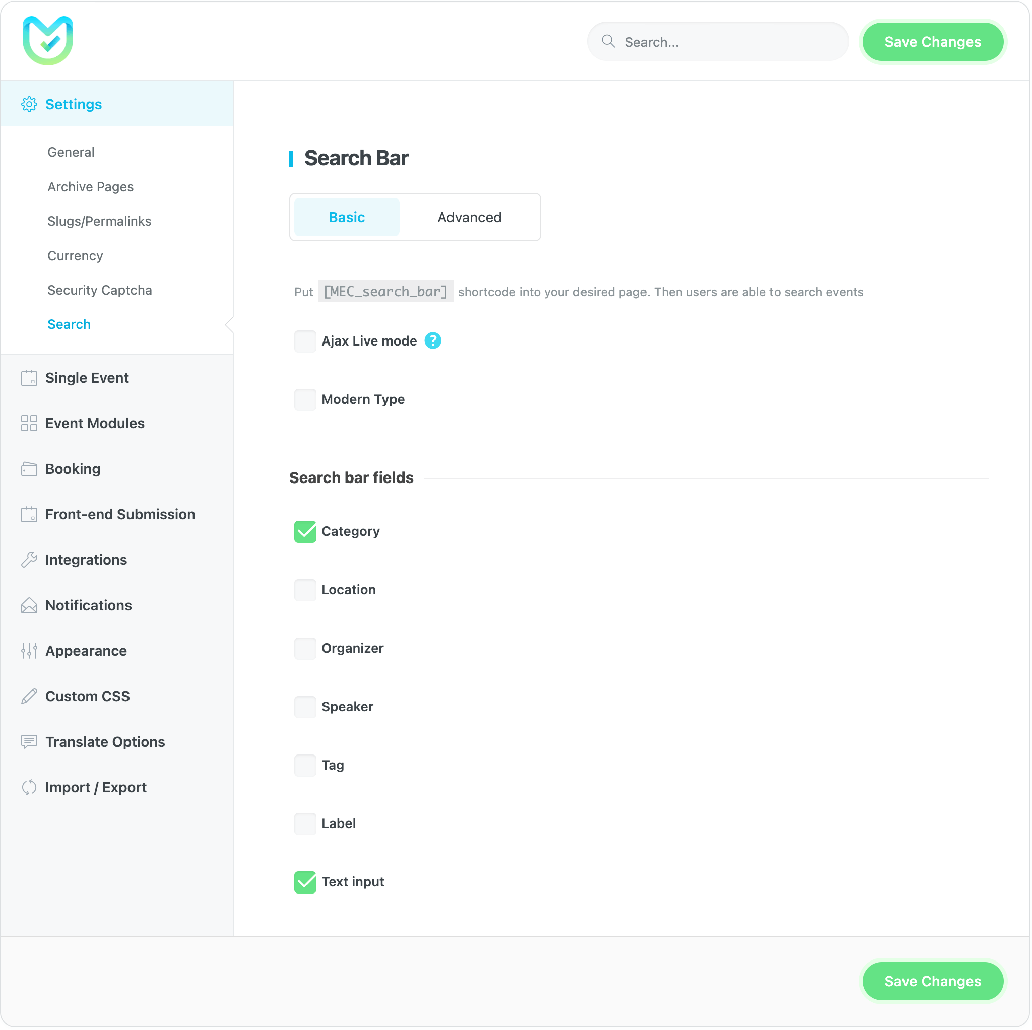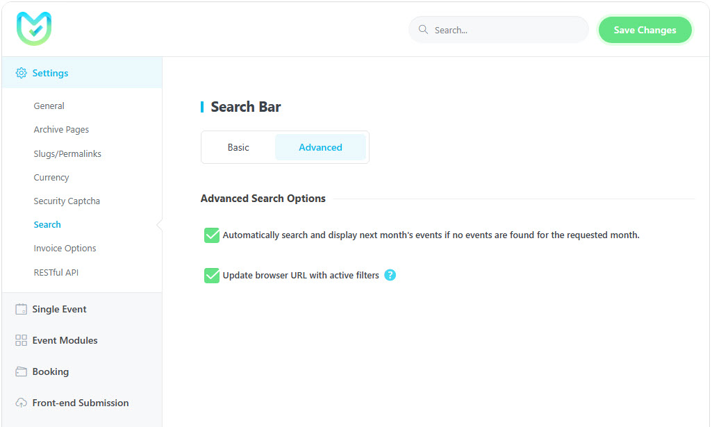 In this section, you will find two tabs: Basic and Advanced. The Basic tab includes the essential settings necessary for MEC to operate correctly. The Advanced tab contains more intricate settings that allow users to add additional features to their calendars.