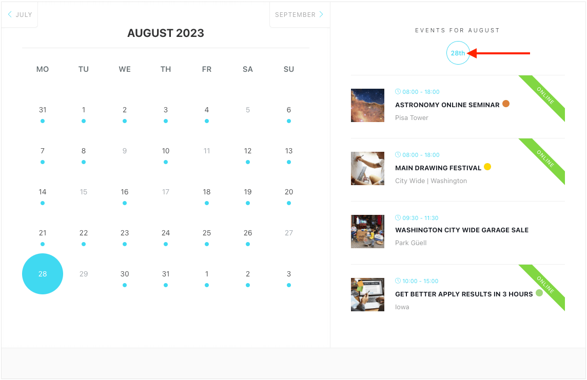 Use Case: This feature is helpful for users who are searching for events and may be disappointed by the absence of events for the current month. With this option, they are automatically shown the events for the following month, making the search process more seamless.
