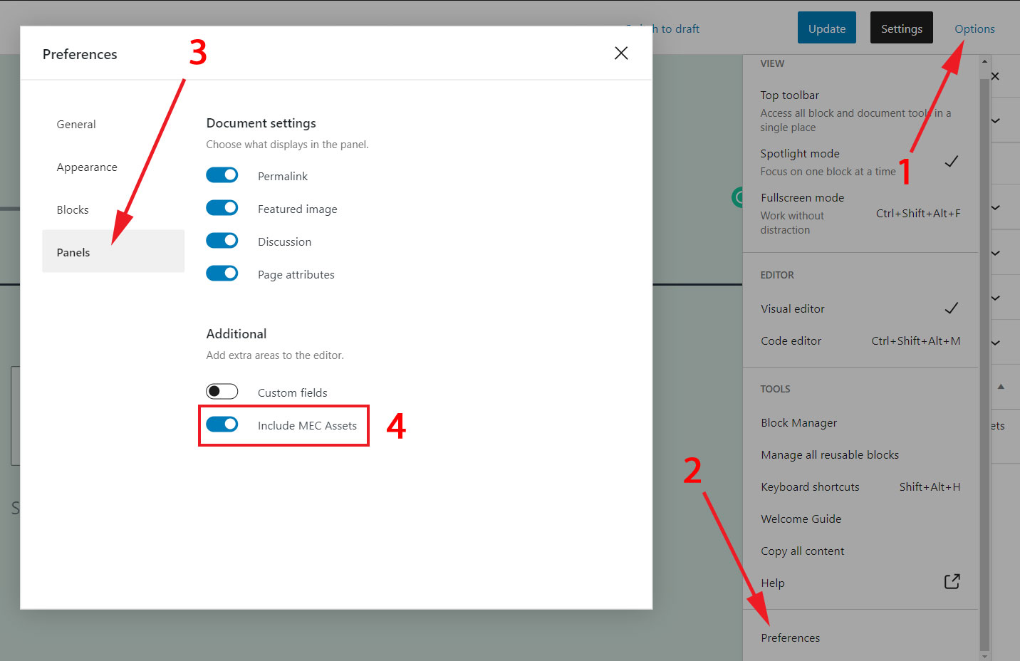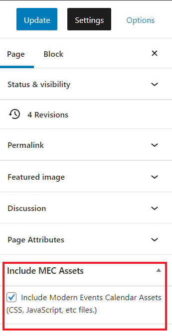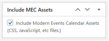 Look for the Include MEC Assets option. If you cannot find it, go to Screen Options (Classic Editor) or Options > Performances (Gutenberg Editor). You can enable it from there.