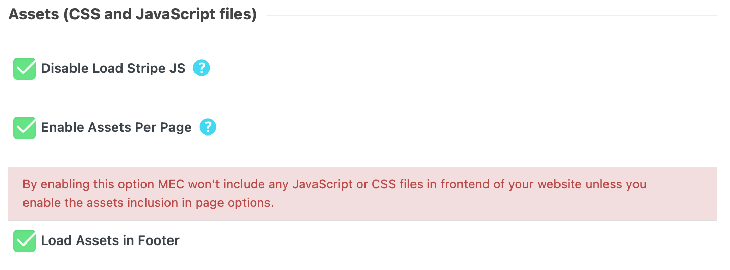 Using this feature, you can have MEC’s assets under control. For instance, if you do not use MEC shortcodes on the Contact Us page, you can enable this feature to prevent the CSS and JS files from being loaded on that page.