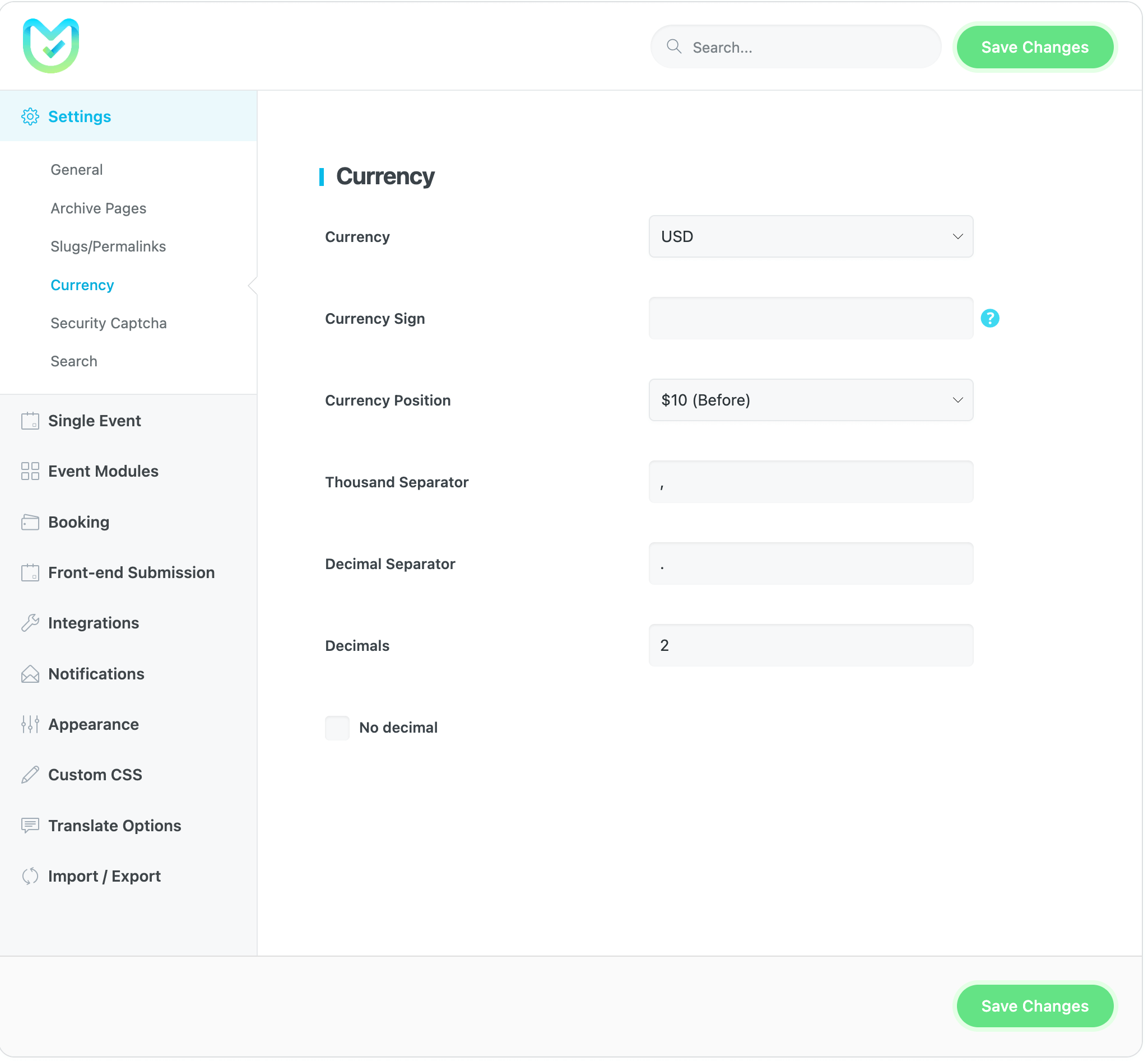 You can change the currency for your event prices and their appearance in this part of the MEC plugin settings. Setup your event calendar currency options like the below: