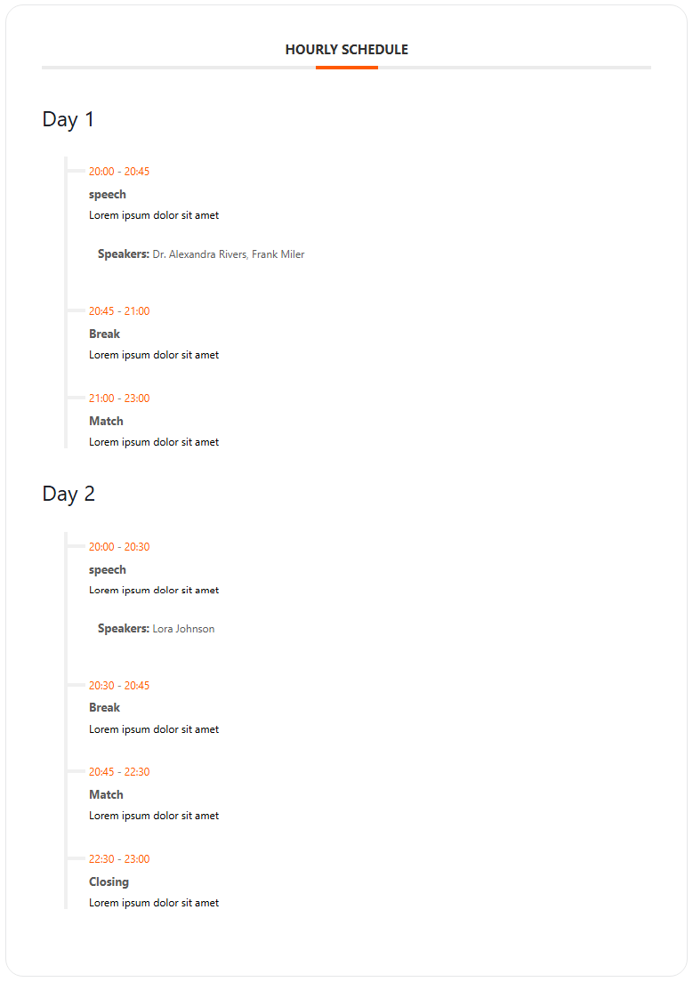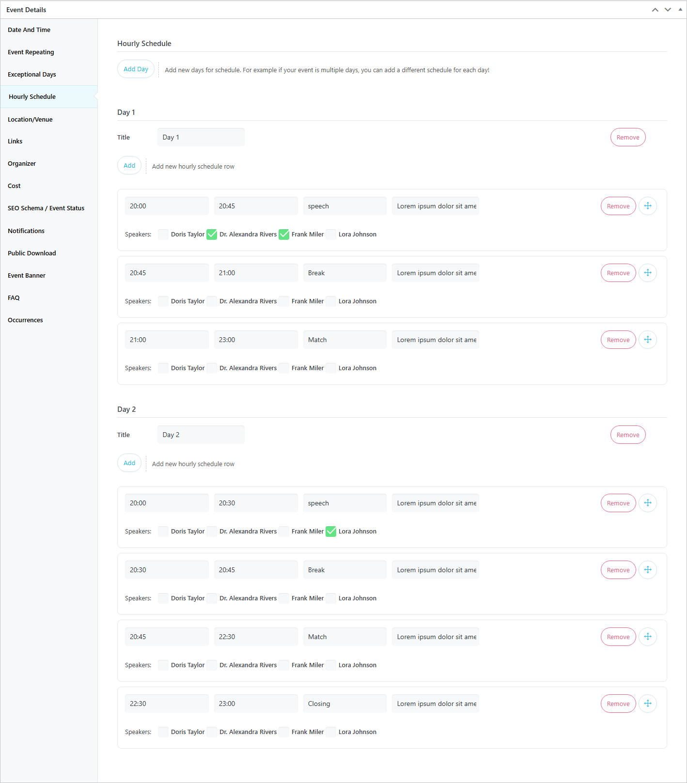 If your event involves multiple programs, it is recommended to use the Hourly Schedule feature to keep your audience informed. To use this feature, simply click on the “Add Day” button and set the schedule for your event based on the start and end times. For example, in my event, there will be two one-hour classes with different speakers, separated by a thirty-minute break for refreshments. This is how the Hourly Schedule section should be set up and what it will look like in the frontend: