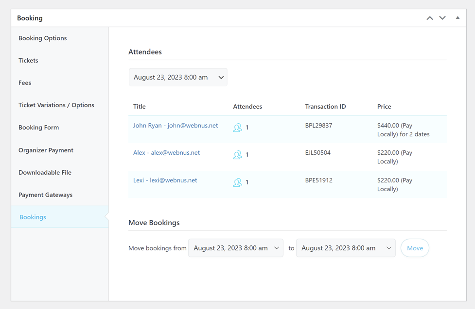Recently, we added new features to help manage bookings in this section. With these features, you can easily transfer bookings for recurring events to a different date. This comes in handy when an event is canceled for any reason and you need to accommodate participants on another date.