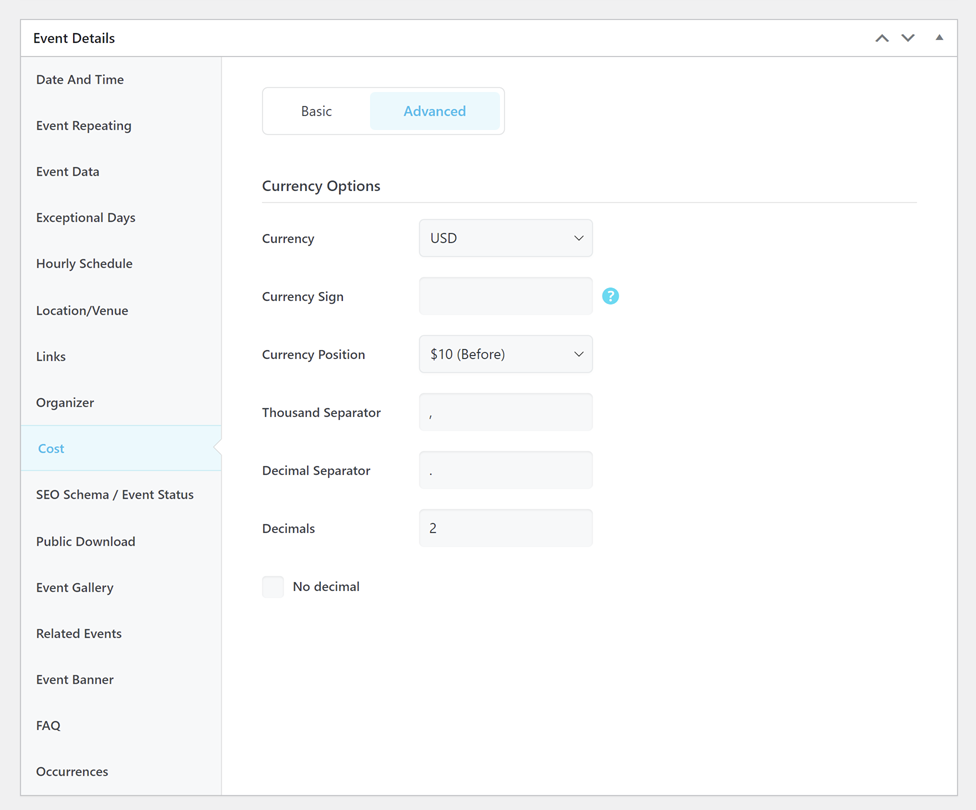 To have the “Currency Options” on the Advanced tab, you need to head over to MEC settings > Single Event Page > Advanced tab and enable the Change Currency Per Event option. Once you access the settings, you can adjust the currency options for this particular event independent of the global settings.