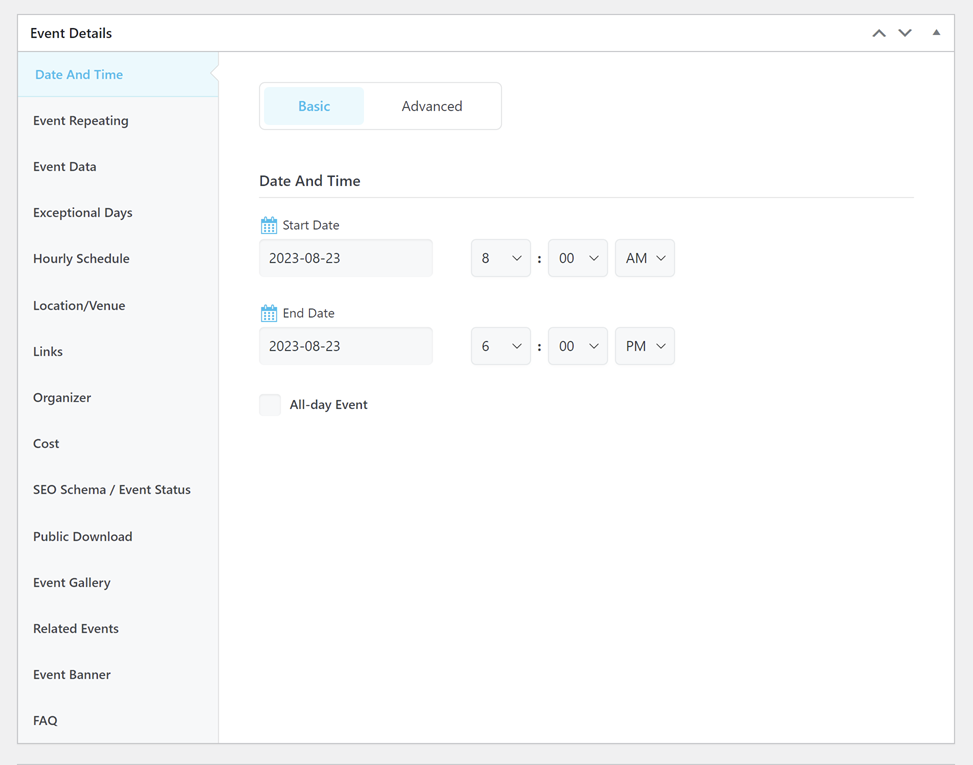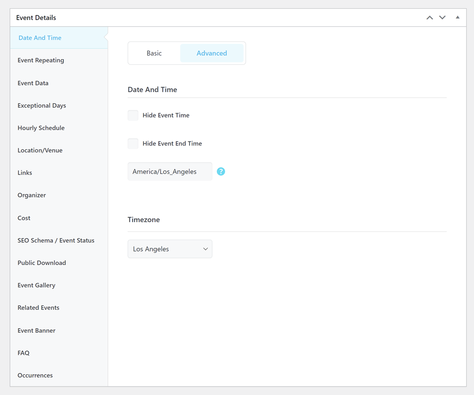 In the Advanced section, there are additional options available. You can choose to hide the event time or end time on the Single event page by selecting the Hide Event Time or Hide Event End Time options.