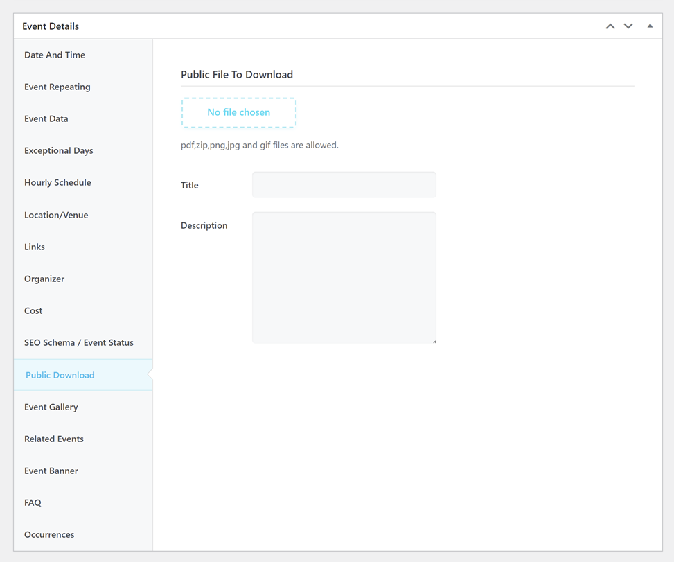 If you need to make a file publicly available to the audience of the event, just select and upload it in this section. The file will be publicly available on the event page. Please note that you need to activate this module from MEC Settings > Single Event > Public Download Module first.