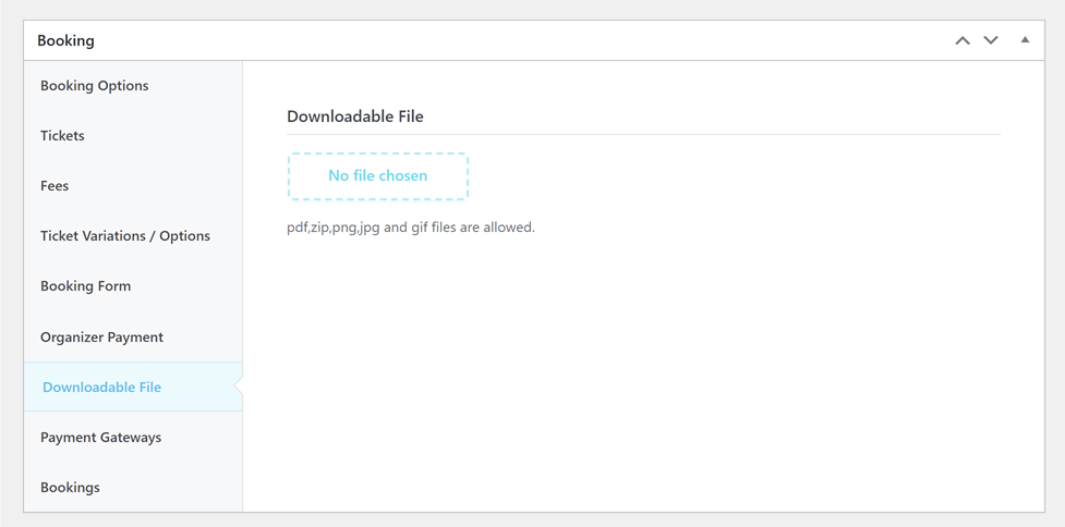 In this section, you have the option to upload a file that will be available for participants to download after they book. To access this feature, you must enable the Downloadable File element from MEC Settings > Booking > Booking Elements.