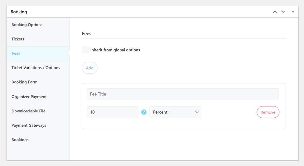 In this section, it is possible to define different fees and taxes to be applied to the final price of the ticket. By default, these values follow the default settings in MEC Settings > Booking > Taxes / Fees, but you can set it as needed for this specific event by disabling the Inherit from the global options checkbox.
