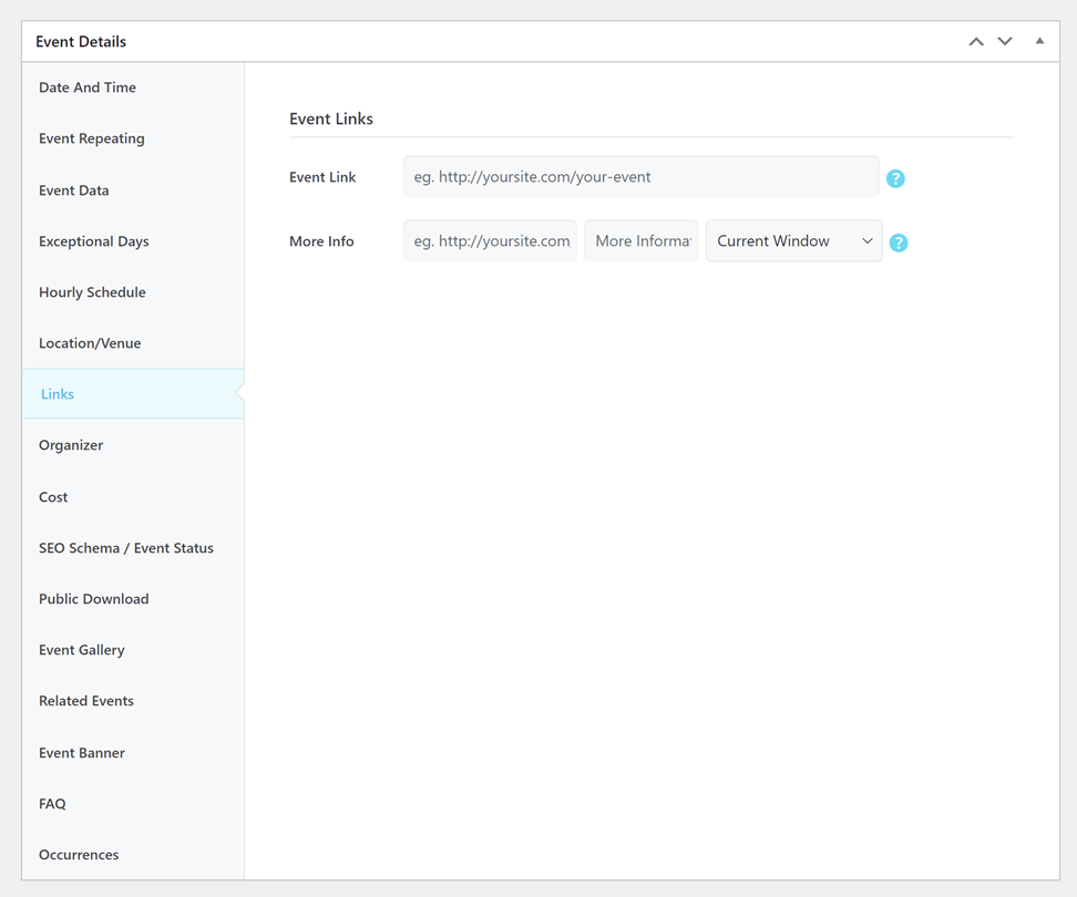 - When you set both “More Info” and “Event Link” then the More Info widget only shows what has been assigned to it. However, the event link will be set only on the event link itself.