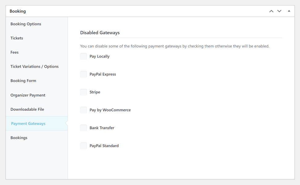Suppose you want the payments you receive for this event to be specified only through a particular payment gateway. All the payment gateways that are globally enabled in MEC Settings > Booking > Payment Gateway are listed in this section so that if needed, you can make any of them unavailable for this specific event. To have access to this section, you need to enable the Disable / Enable payment gateways per event option from MEC Settings > Booking > Payment gateways.